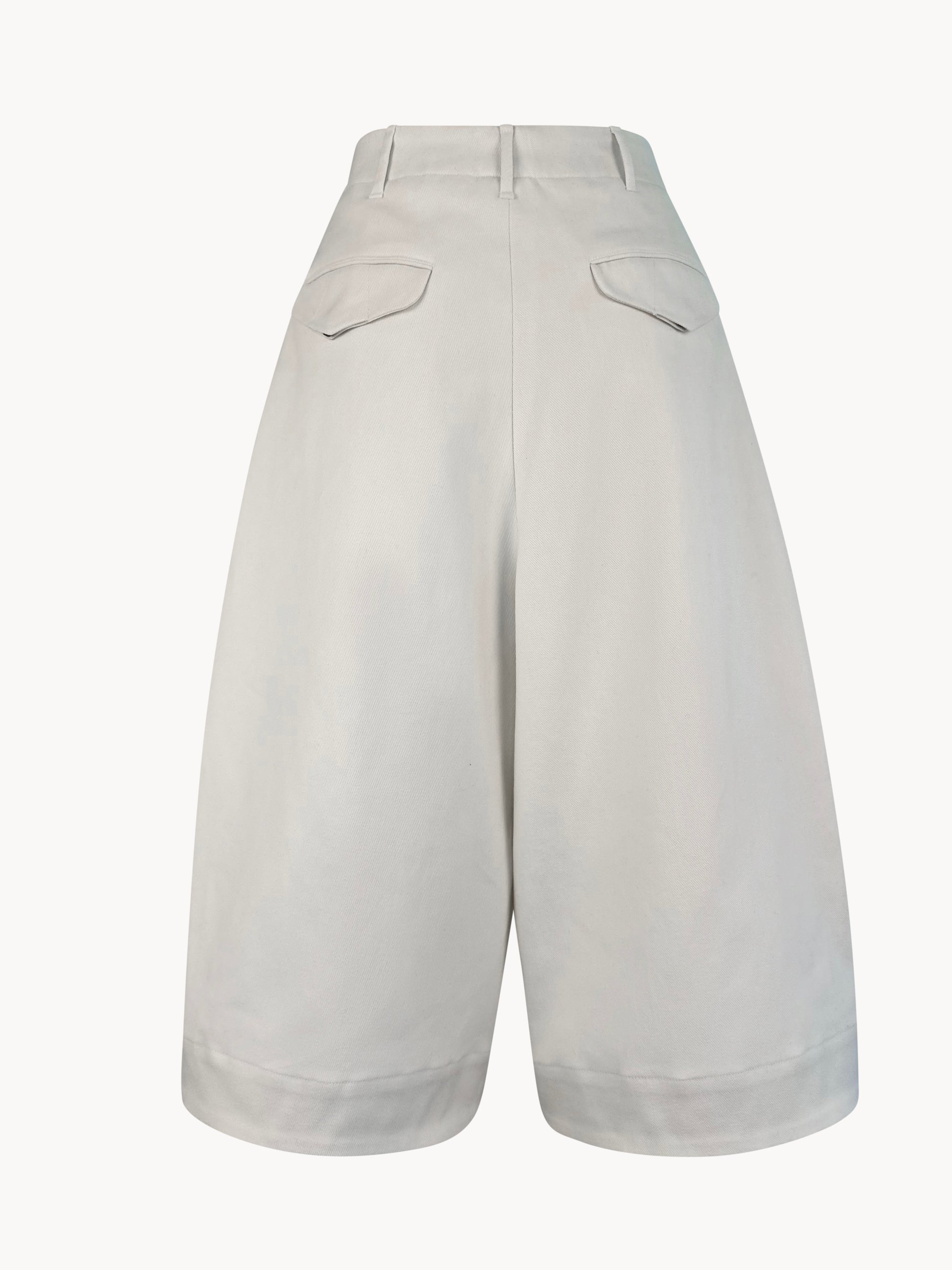 Culotte in a generous volume with two patch pockets in the front and the back in heavy cotton stretch with velvet touch. This garment is crafted with cottonway fabric made in Italy by Loro Piana.
