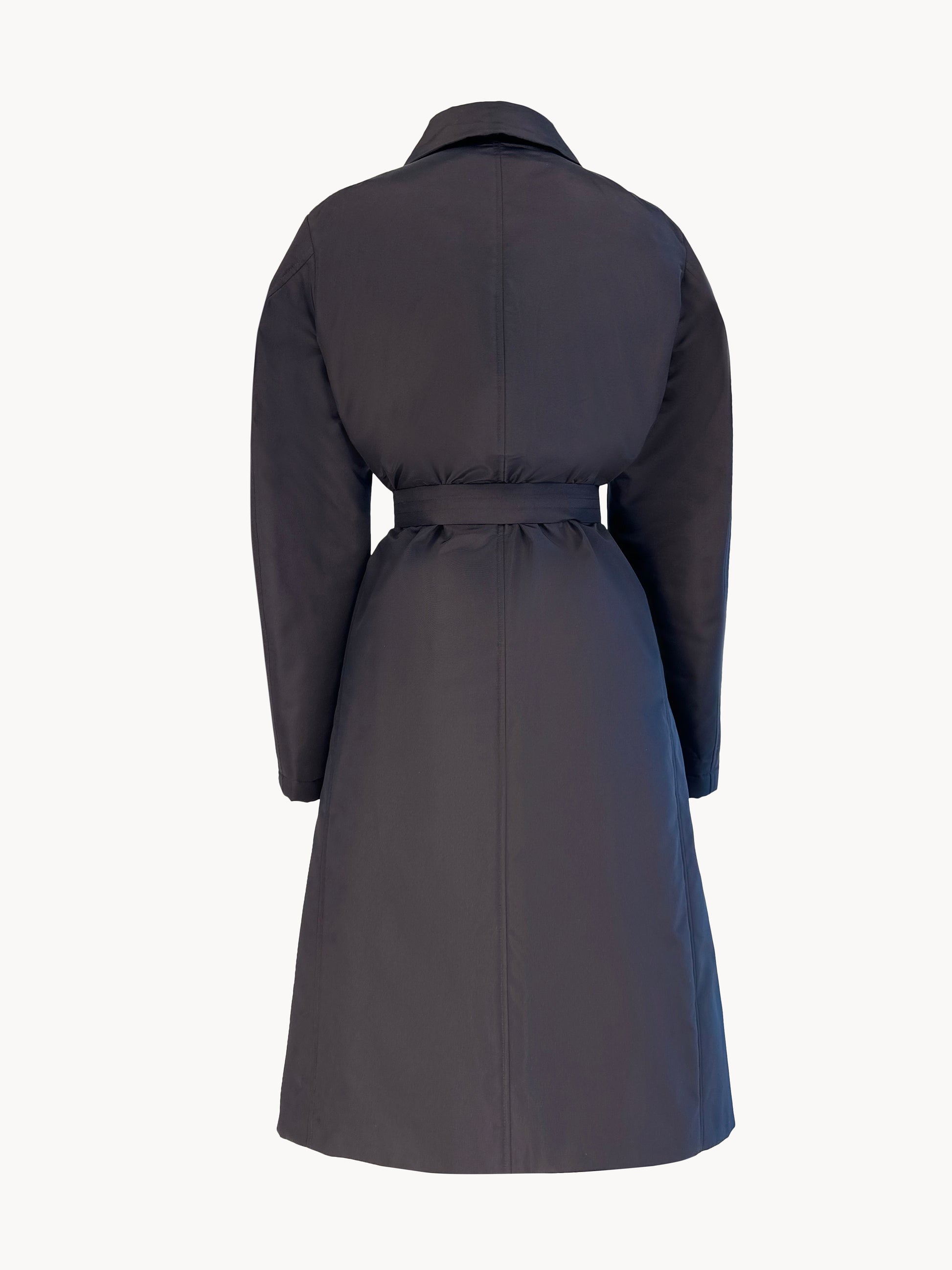 The Catherine raincoat is made in padded,waterproof, pure silk. It has two side seam pockets, hidden front-closure with signature horn buttons a casual, yet fitted volume. It can be worn with the included belt.