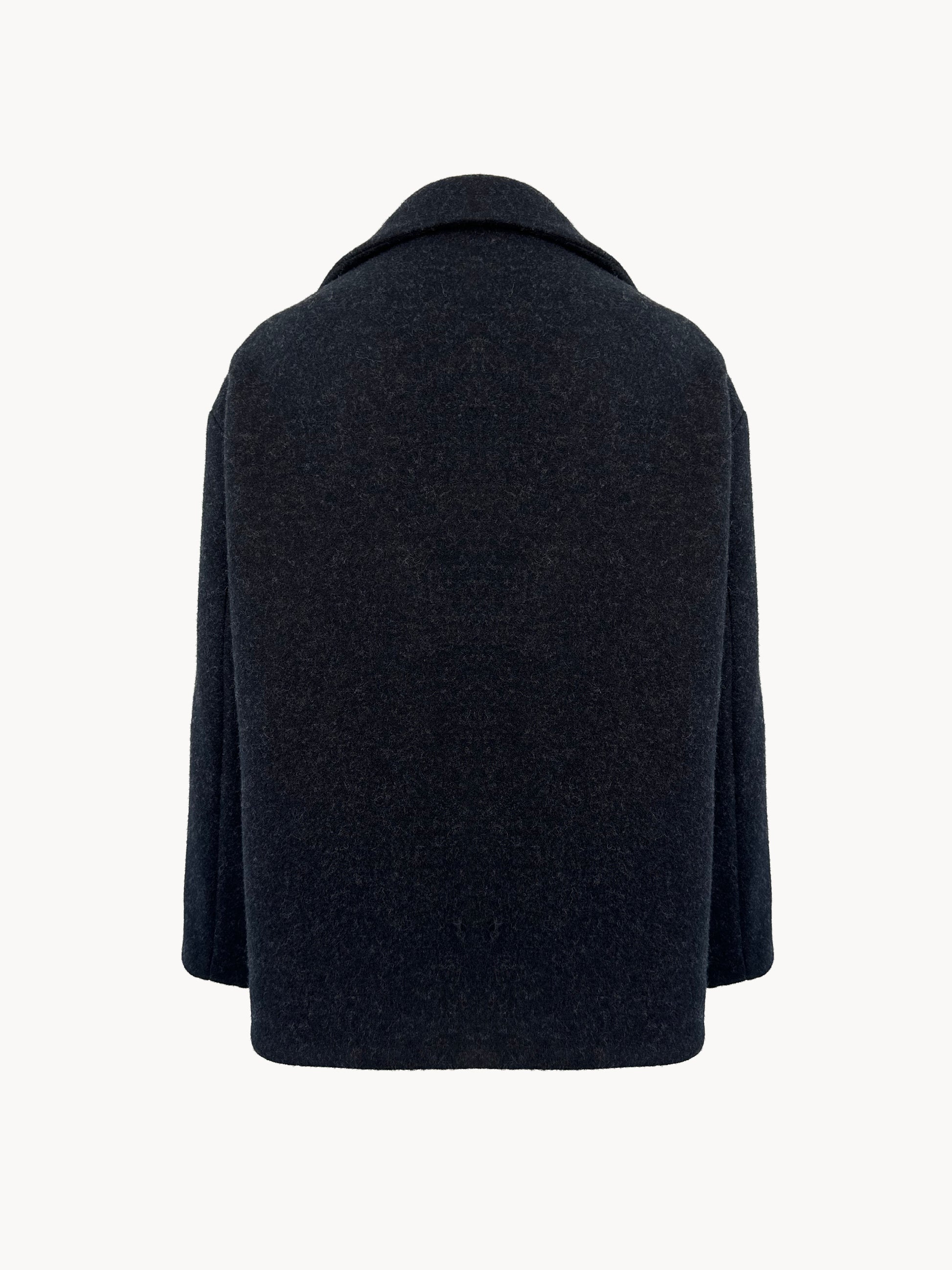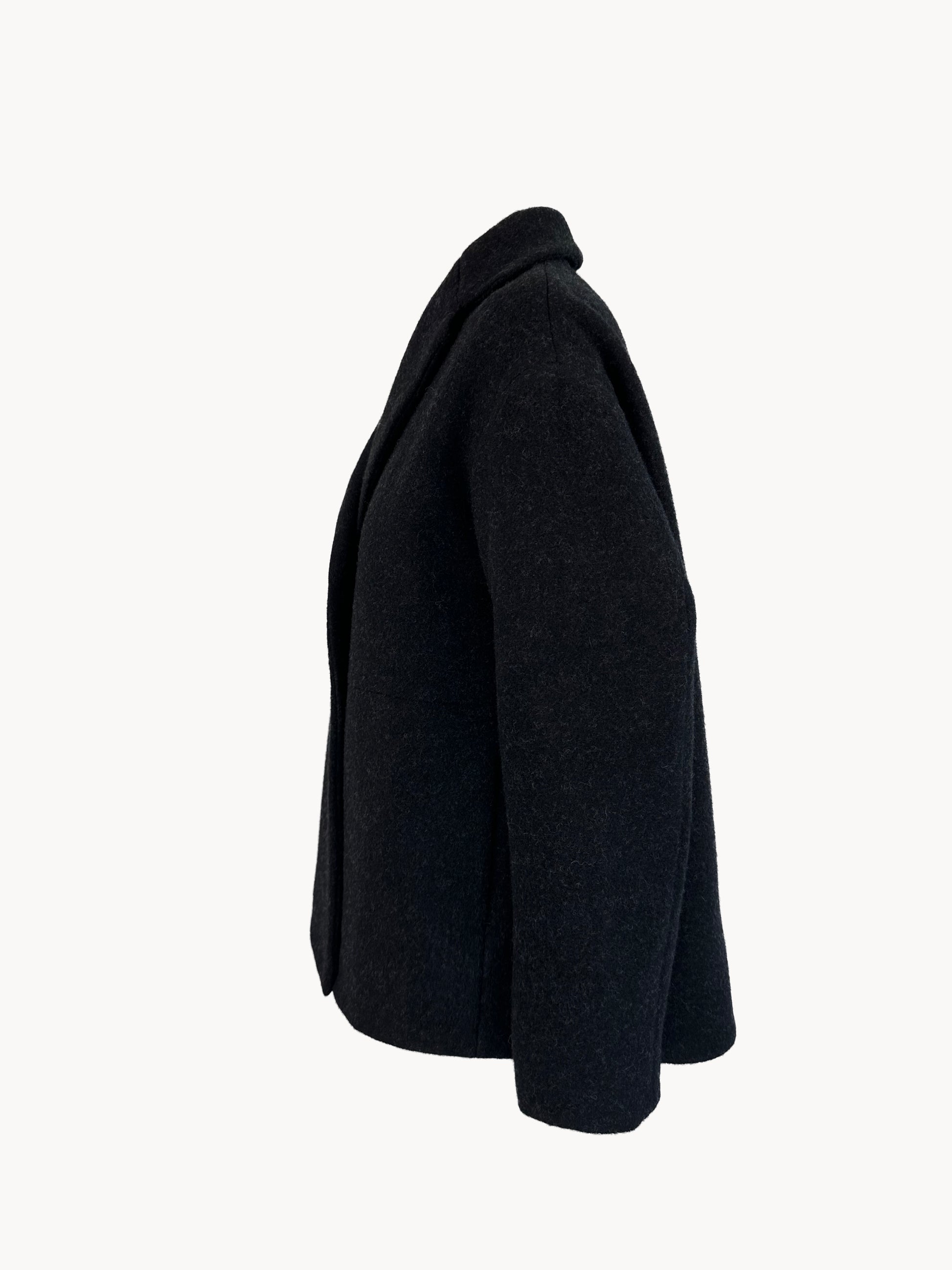 Outdoorjacket in soft felted, wool with side seam pockets, hidden press buttons and an unconstructed shoulder. The back is slightly longer than the front.